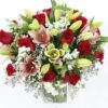 Ramo con personalidad, carácter y color, con 6 rosas rojas, lilium blanco, astroemeria y paniculatas blancas. Perfecto para sorprender.