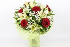 Ramo con personalidad, carácter y color, con 5 rosas rojas, lilium blanco, astroemeria y paniculatas blancas. Perfecto para sorprender.