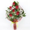 Sorprende con un ramo de 12 rosas rojas de tallo largo, con verdes variados y acabado con paniculatas blancas.