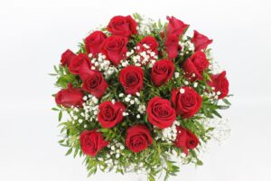 Espectacular y elegante ramo circular de 20 rosas rojas con paniculatas blancas. Un ramo con fuerza y carácter, lleno de pasión.