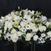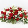 Centro de condolencias con floraciones blancas y rosas rojas. (Cinta de condolencias incluida)