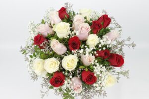Perfecto regalo para un día muy especial, 25 rosas en tonos rojos, blancos y rosas, con limonium y paniculatas. Un ramo para recordar.